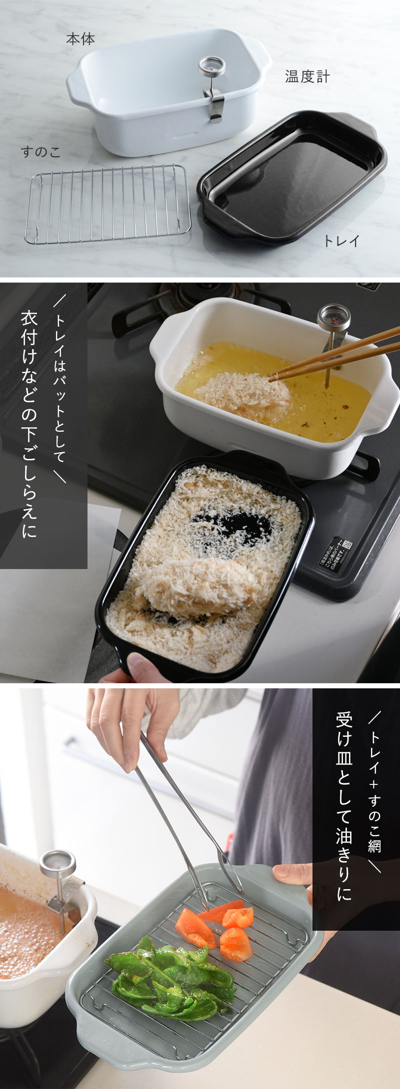 防水型の温度計・トレイ・すのこ網がセットになっているので、手軽に揚げ物料理にチャレンジできます。
