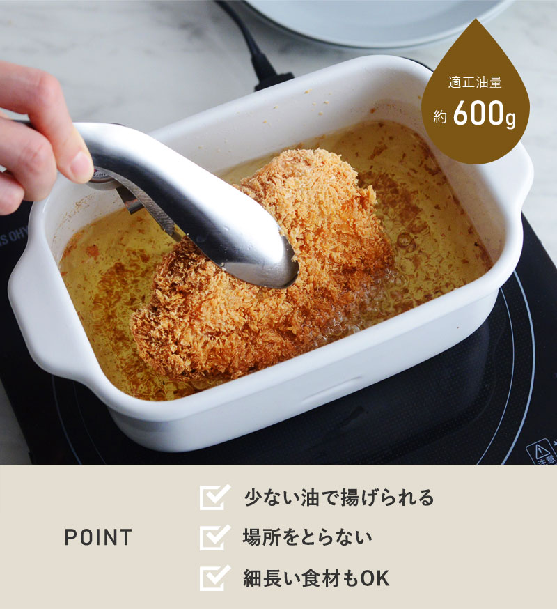 スリムな角型天ぷら鍋は、幅25cm×奥行14.5cmとコンパクトで使いやすく、コンロの上でも場所をとりません。深さは9cmあるので少ない油で調理することができ、処分する油も抑えられます。