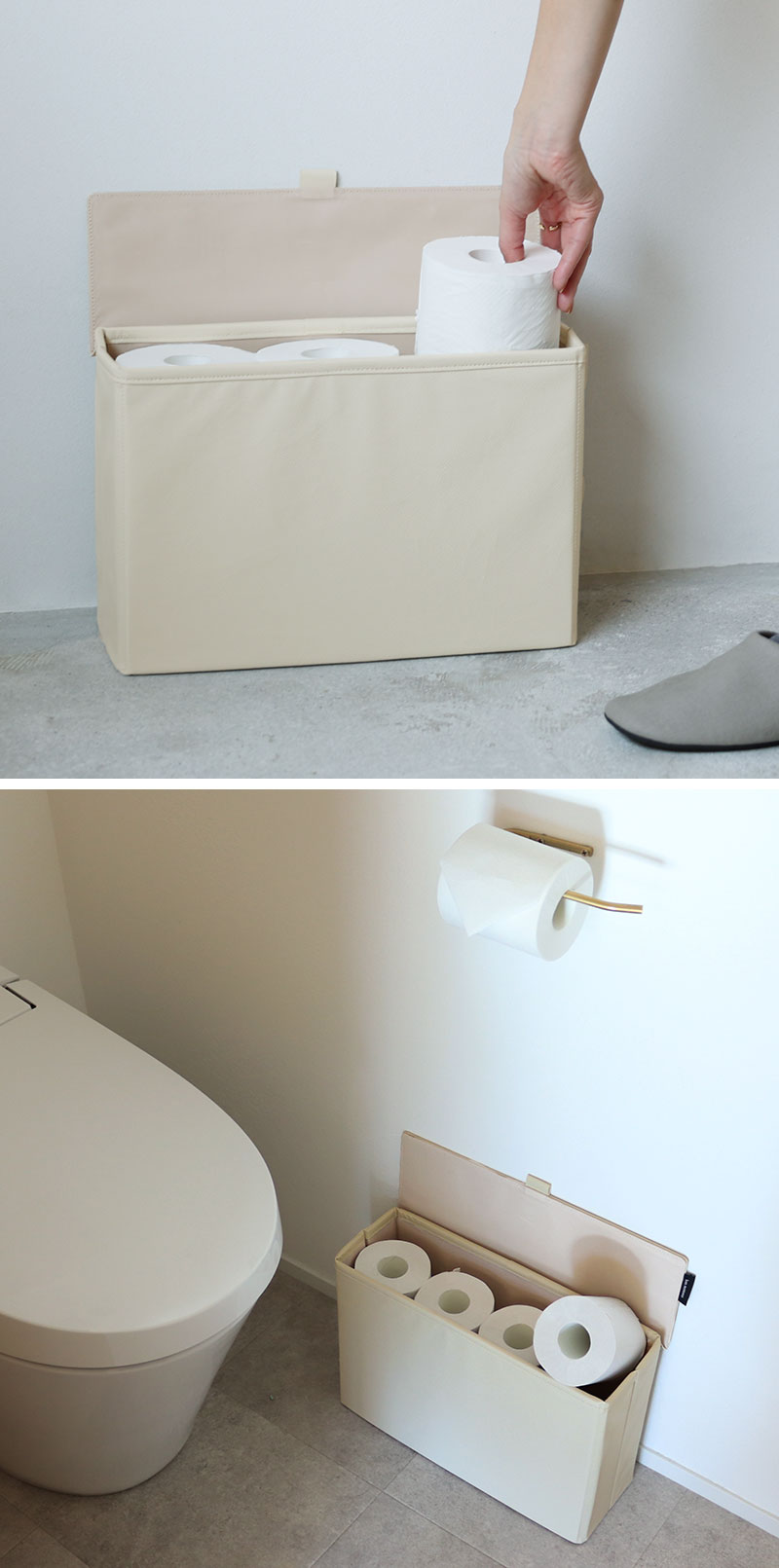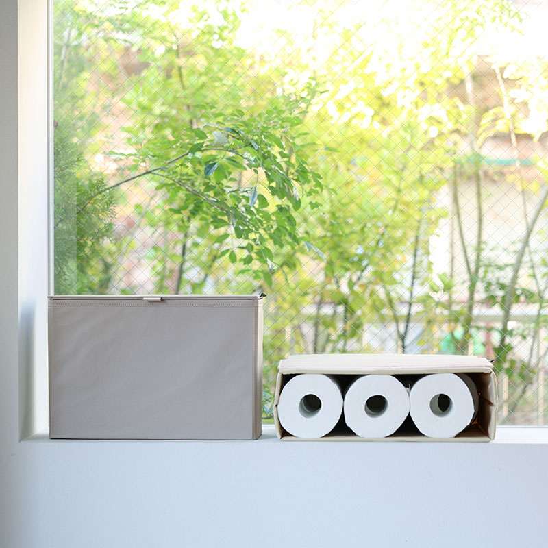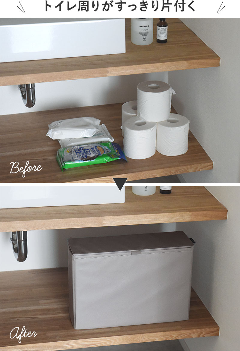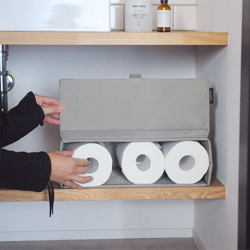 そんなときに便利なのが、手狭な空間にもすっきり置ける「目隠し収納」。トイレットペーパーが6〜8ロール分入るくらいの収納力で、見せたくないものをすっきり目隠し。出しっぱなしも絵になるフェイクレザー素材で、生活感ともおさらばできそうです。