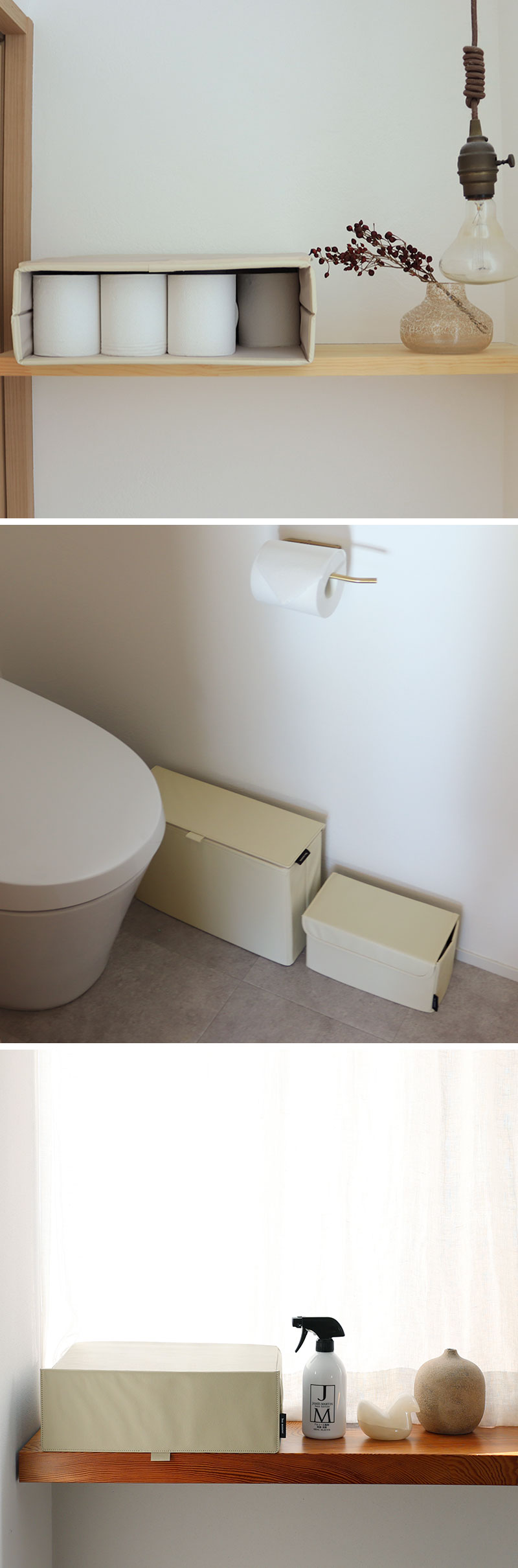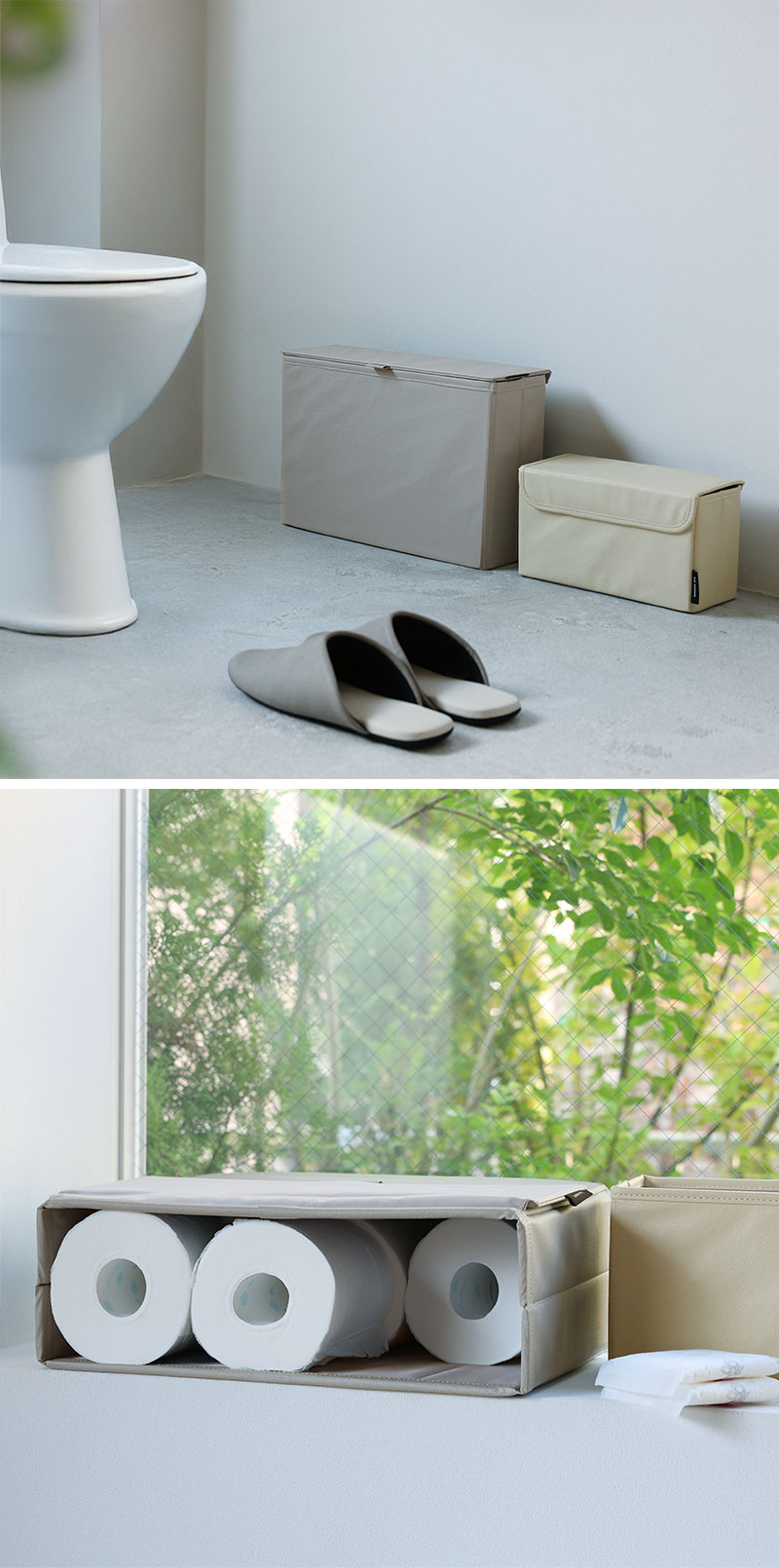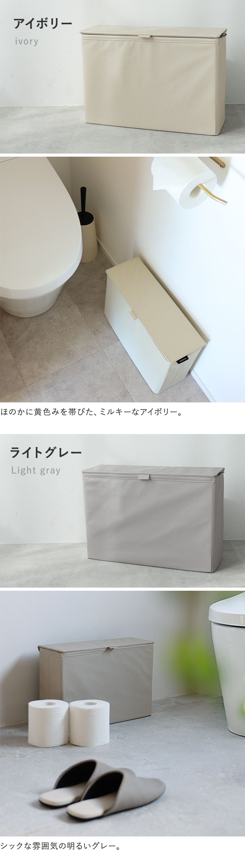 そんなときに便利なのが、手狭な空間にもすっきり置ける「目隠し収納」。トイレットペーパーが6〜8ロール分入るくらいの収納力で、見せたくないものをすっきり目隠し。出しっぱなしも絵になるフェイクレザー素材で、生活感ともおさらばできそうです。