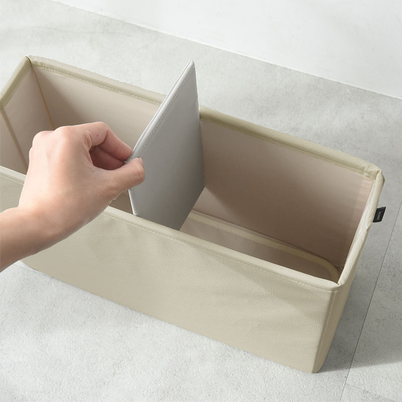 動かせる仕切りが付いていて、入れたいものによって調整ができます。