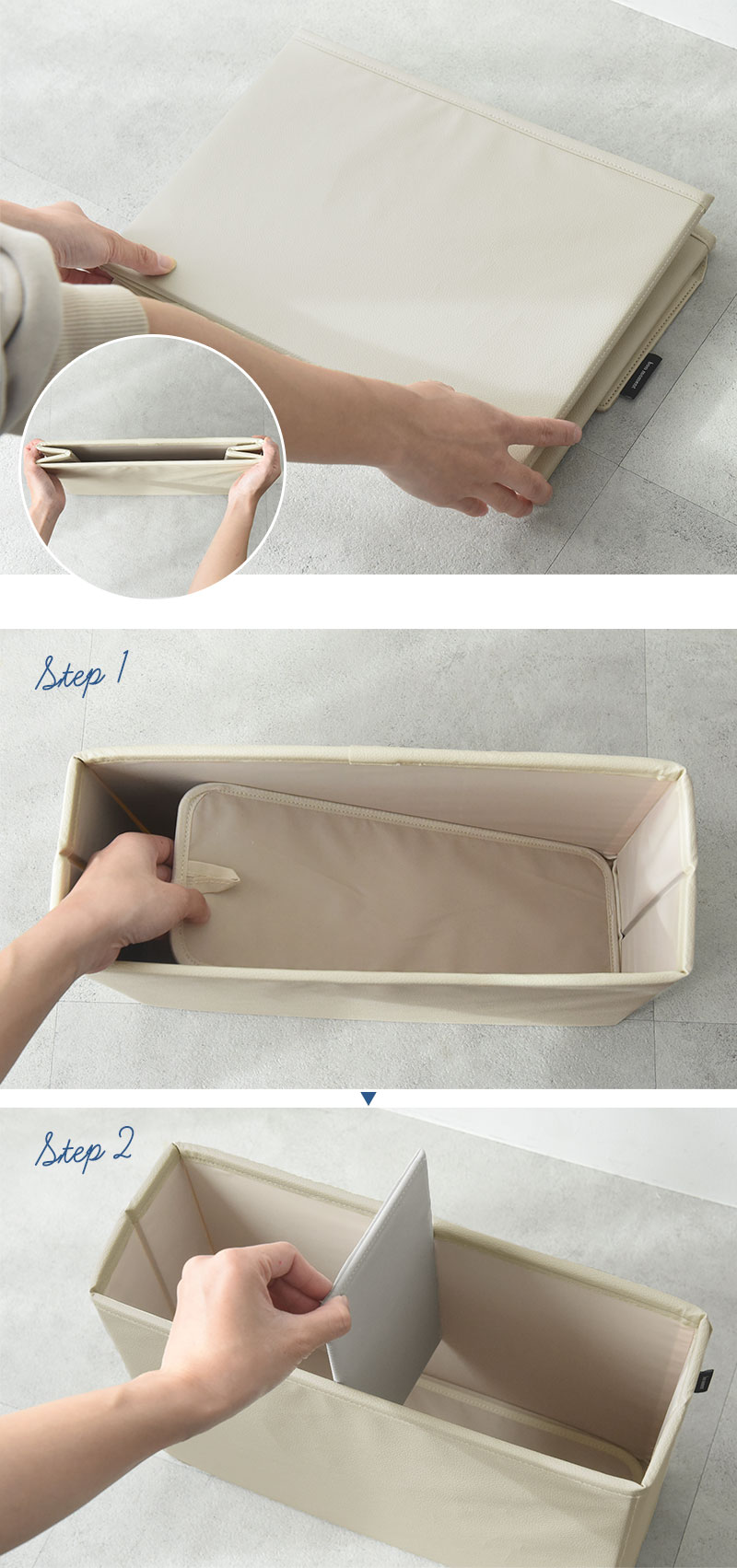 1.本体を広げ、底板を中に敷きます