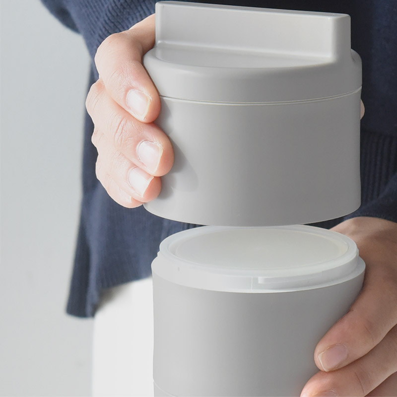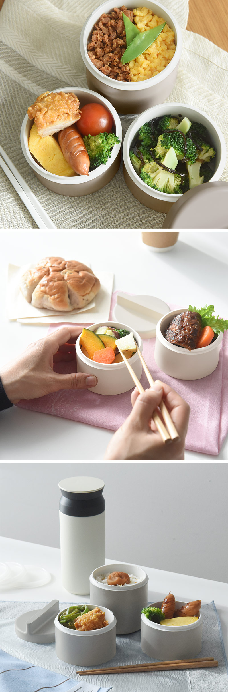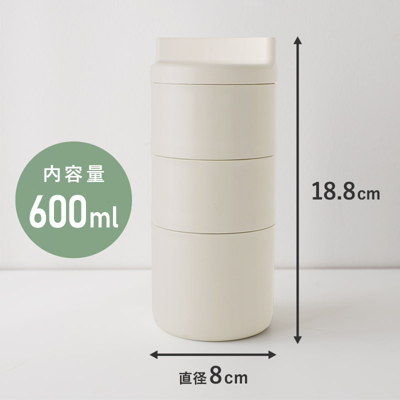 また、縦型タイプならではの良さも。水筒のようにバッグの隙間にスッと収まるから、持ち歩きやすさ◎。3段で量が多いときは2段にするなど調整もできます。