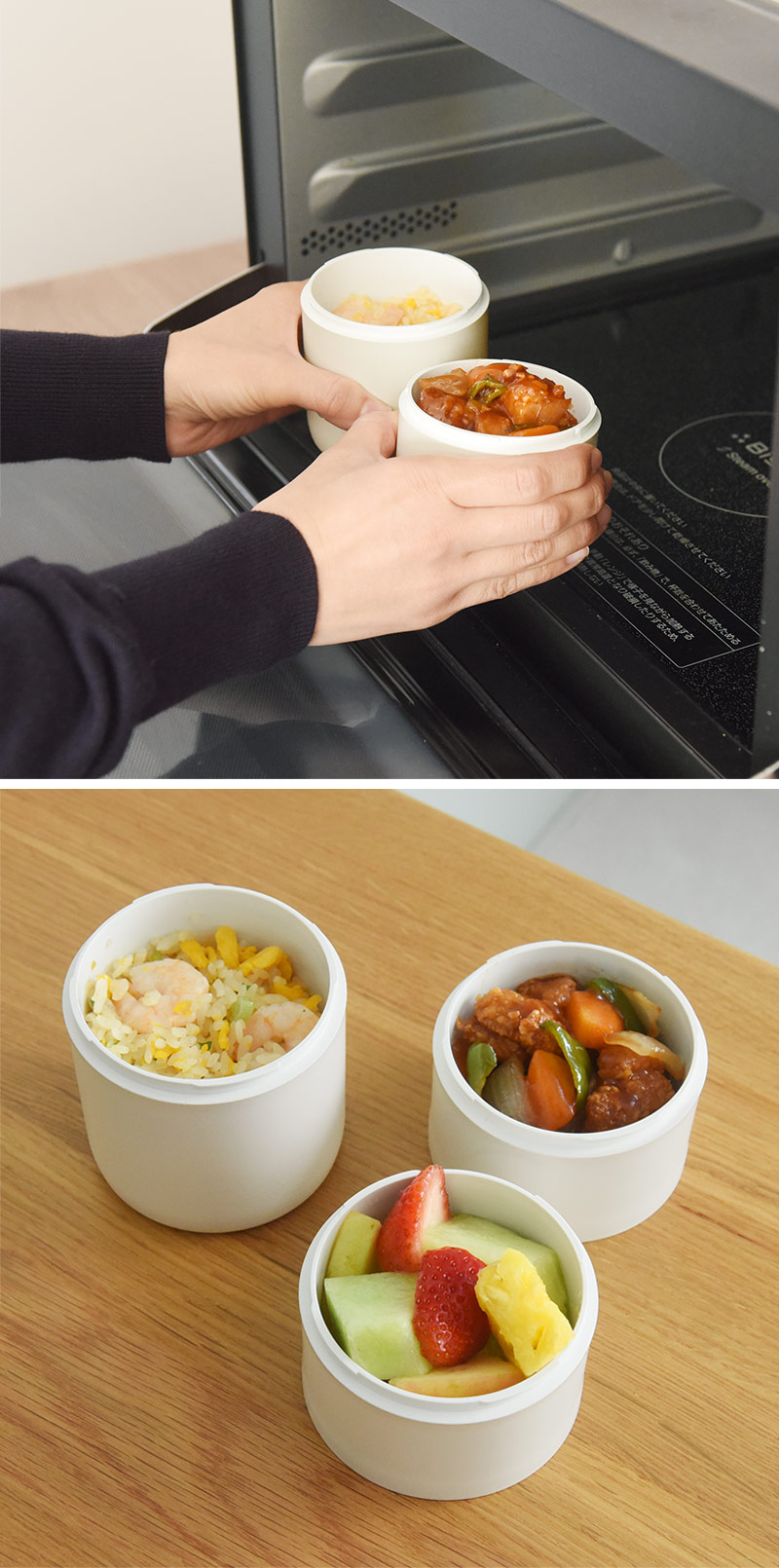 段ごとにレンジ加熱可能3段をばらばらにできるのでサラダや卵料理、フルーツなどレンジ加熱したくないものを段ごとで分けてチンできるのも嬉しいポイント。中蓋以外電子レンジ対応です。