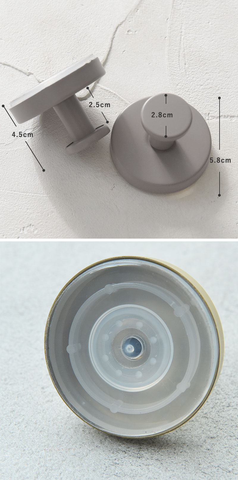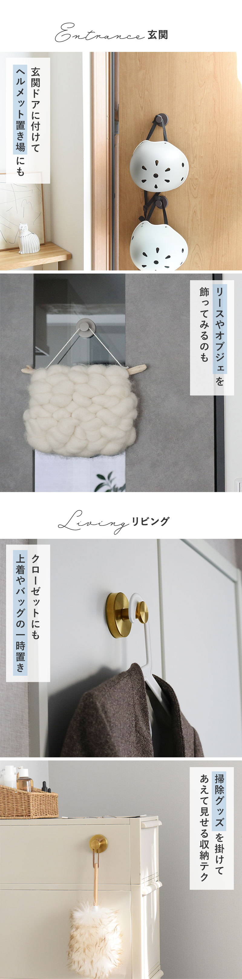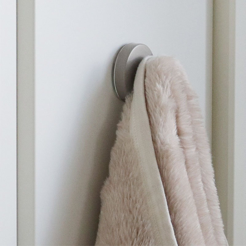 そんなお悩みを解決してくれるのがこちら。極厚吸盤が壁にピタッと密着、くるくる回すと真空状態になり、ガッチリ固定できる強力フックです。とっても強力ですが、「いかにも強そう」な見た目でないのもポイント。玄関キッチンリビングにもすっと馴染みます。