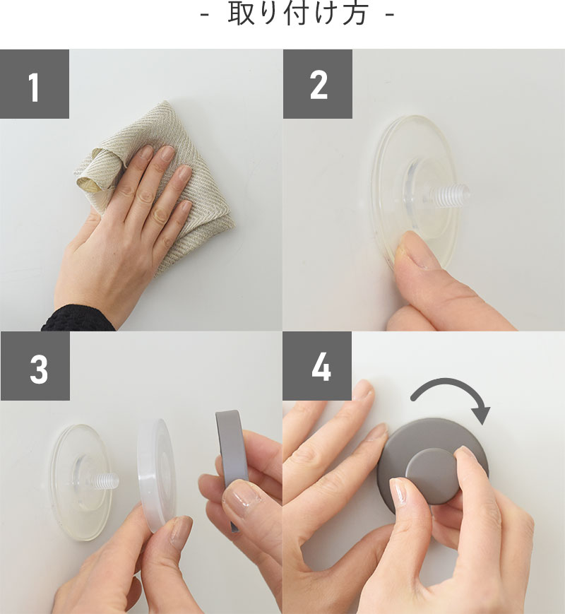 極厚の吸盤で取り付けたい場所にピタッとくっつき、スクリューをくるくる回すと真空状態に。シッカリ固定がされるフックで、ずり落ちてくる心配を軽減します。