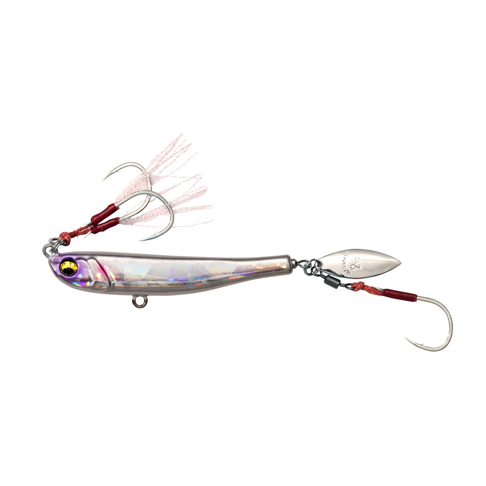 マキッパはその名の通り、投げて巻くだけの新感覚キャスティング・ブレードジグ。ソルトウォーターシーンにおいて、キャスティングジグは飛距離性能と多様な魚種に有効なことから定番のルアーとなっていますが、思い描いたアクションを出すのが難しかったり、狙ったレンジをキープしづらかったりと、使うには慣れや経験が必要なルアーといえます。マキッパは、キャスティングジグの使いにくさをカバーし、誰もが簡単に扱えるよう、徹底チューンを施しました。テールには巻くだけで集魚効果の高いブレードを装着し、さらにブレードの回転を阻害せずにブレードバイトを高確率でフックアップ可能な、ブレードフックシステム(PAT.)を搭載。計算されたボディバランスと各パーツの配置により、ボディが回転することなく安定したスイミング&フラッシングでターゲットを誘います。使い方は着水後、即リーリングすれば表層を、沈めてからリーリングすれば中層やボトム付近をレンジキープするため、ターゲットの泳層に合わせた攻略ができます。あらゆる魚種に効果的なティンセル付きアシストフックを標準装備しており、また腹部に設けたおまかせアイにより、好みに合わせてダブル、トリプルフックなどを追加装着可能です。特にボトムからバイトしてくる魚には、おまかせアイへのフック装着が効果的。対象魚は、シーバス、ヒラメ、マゴチ、ブリ(イナダ、ワラサ)、サワラ、カンパチ、アジ、サバ、タチウオ、マダイ、クロダイ、根魚類と、多種多様なターゲット。マキッパを貴方のソルトウォーター釣行に常備すれば、あらゆる釣り場で活躍してくれることでしょう。