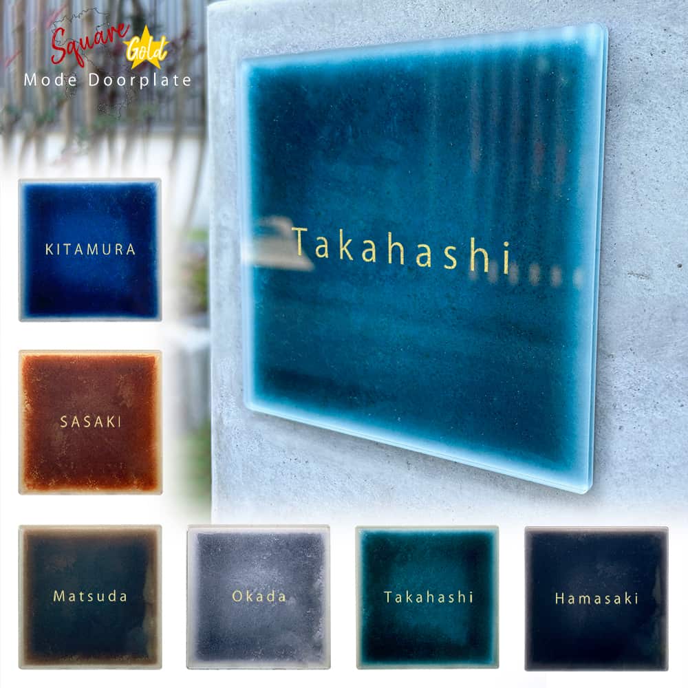 ■磁器タイル風×ゴールド箔押しのリッチな表札 磁器タイルの風合いを再現したおしゃれなデザイン。4mm厚のアクリルに金箔を施した贅沢な仕上がりです。UVカット加工済みで黄変しにくく、軽量で丈夫なため長年ご愛用いただけます。