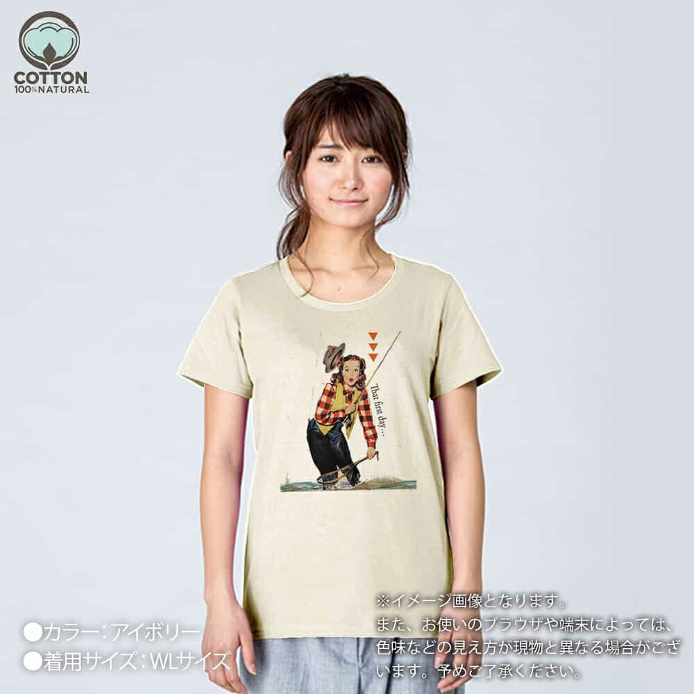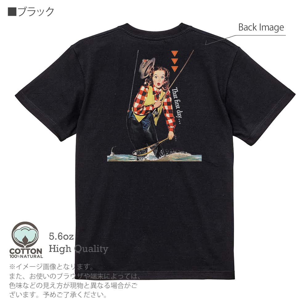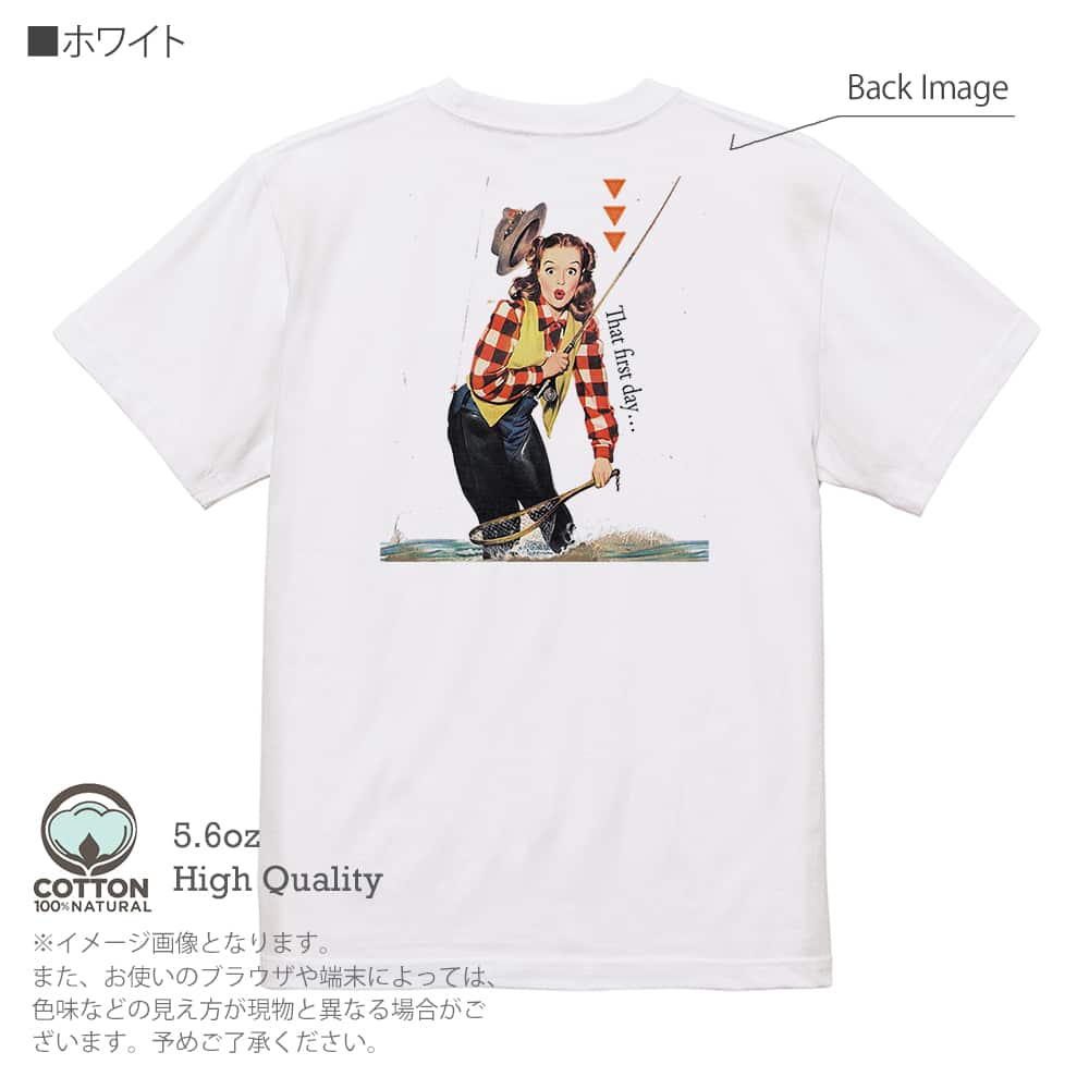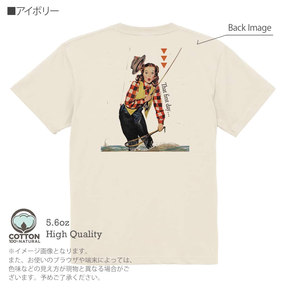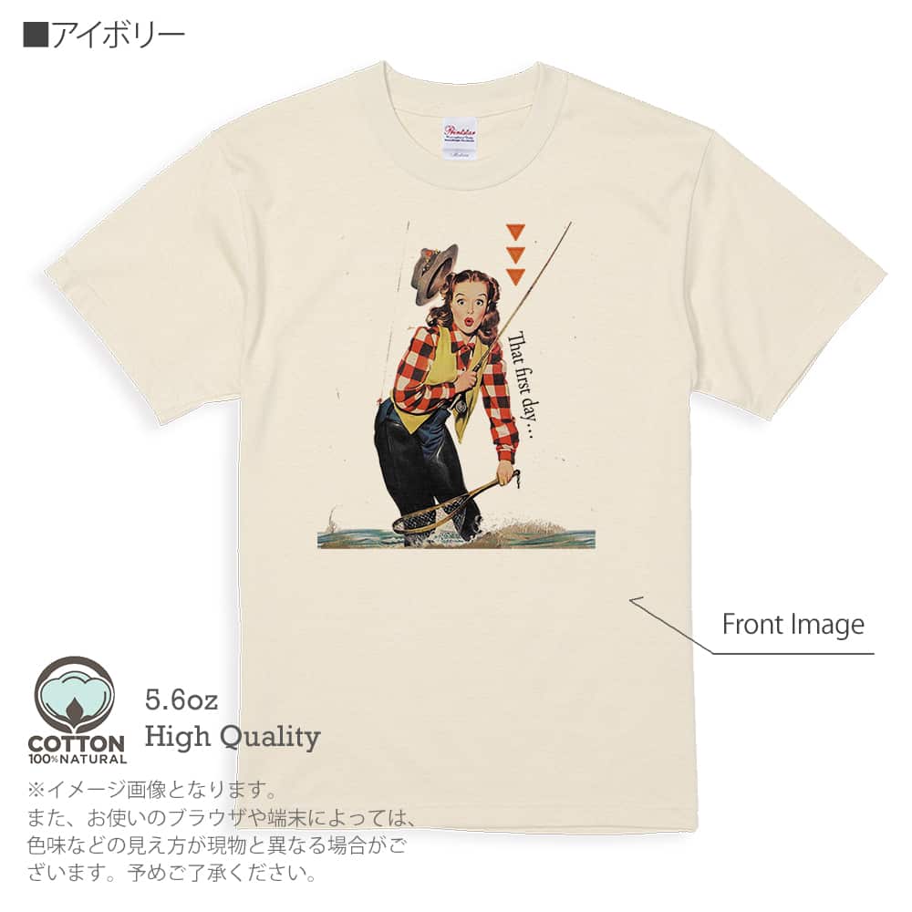 商品説明Cannon Percale Sheetsのポスター画像のオマージュ。初めての時…と書かれ、いかにもアメリカンな女性がフライをズボンに引っ掛けているイラスト。キュートな顔がたまらない。