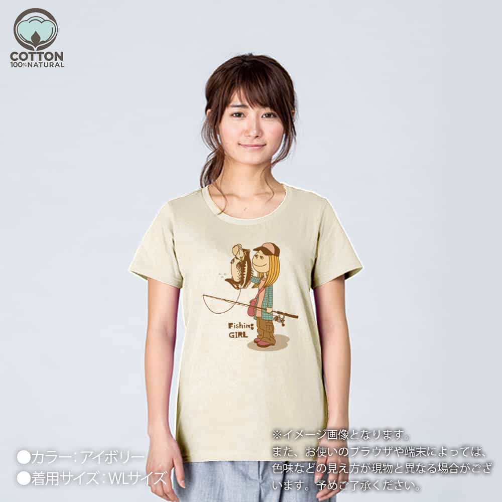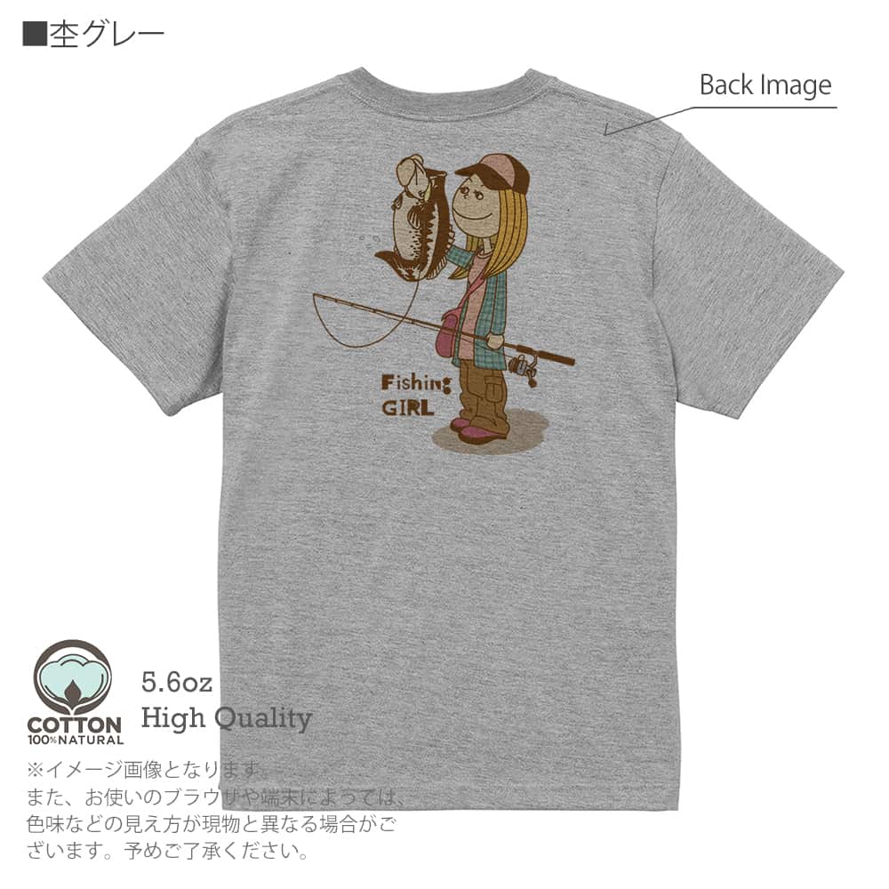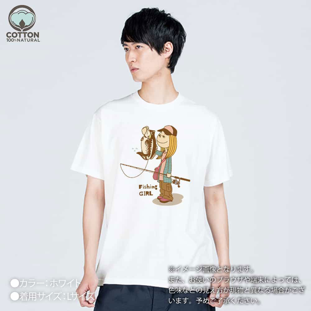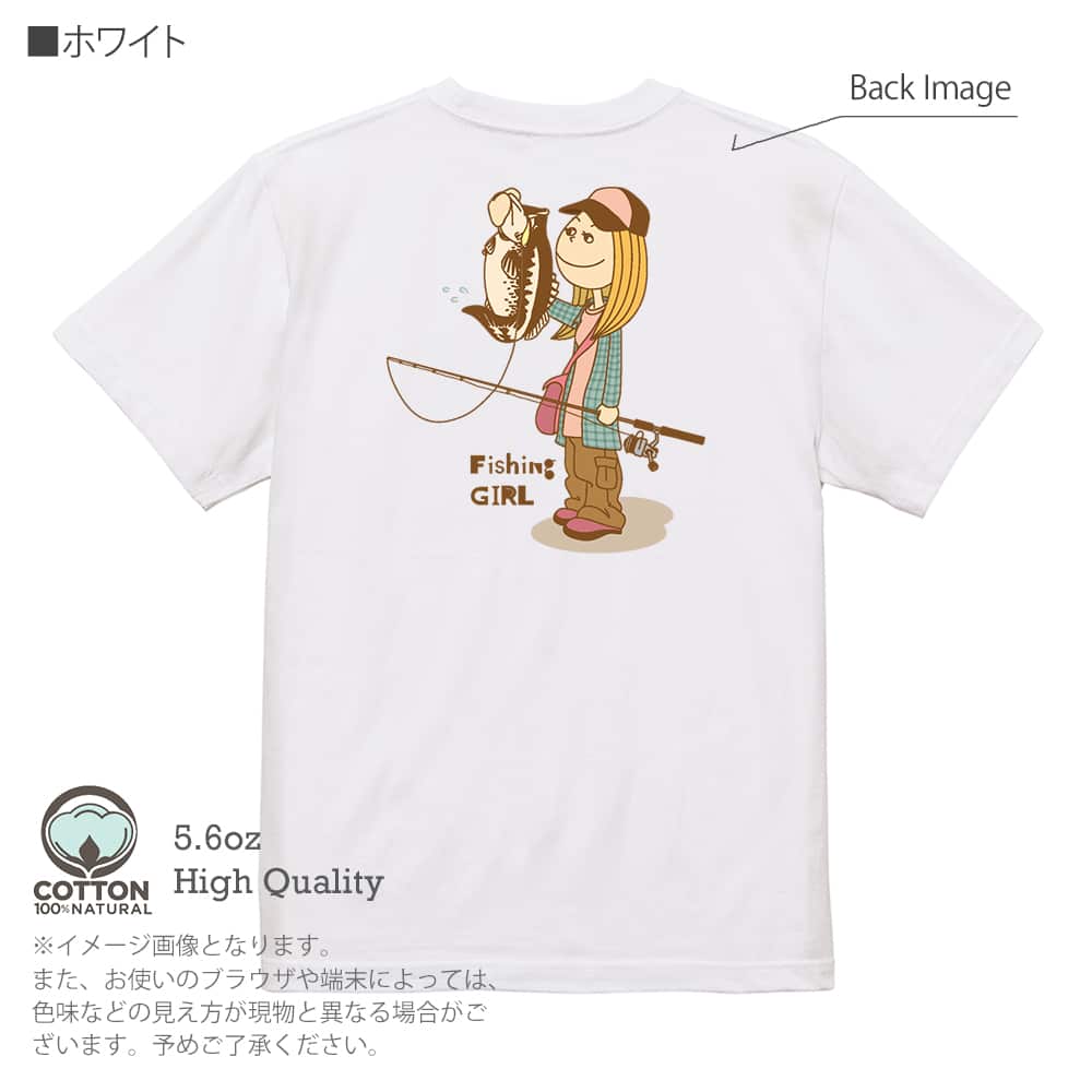 商品説明釣りガールがバスを釣り上げたイラスト。可愛いイラストにナチュラルカラーがいい具合。ライト・アングラーにオススメのデザインです!
