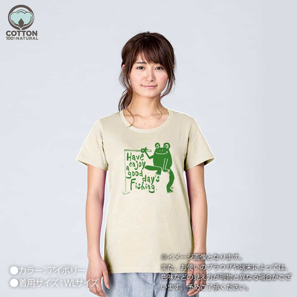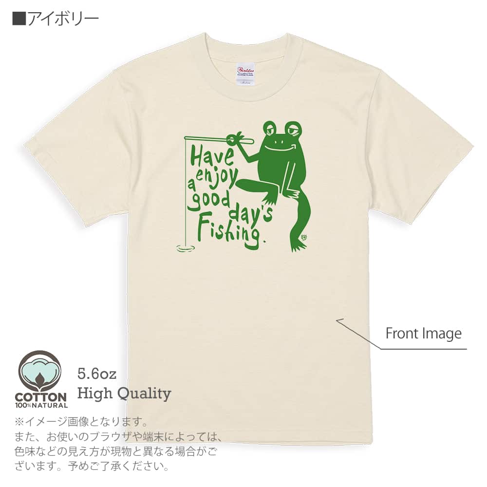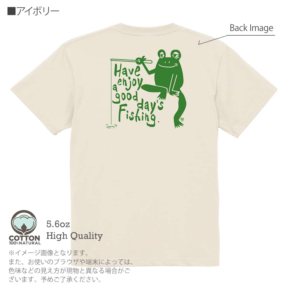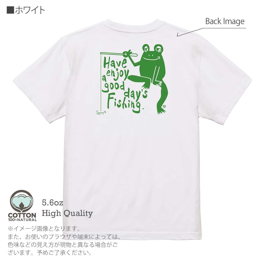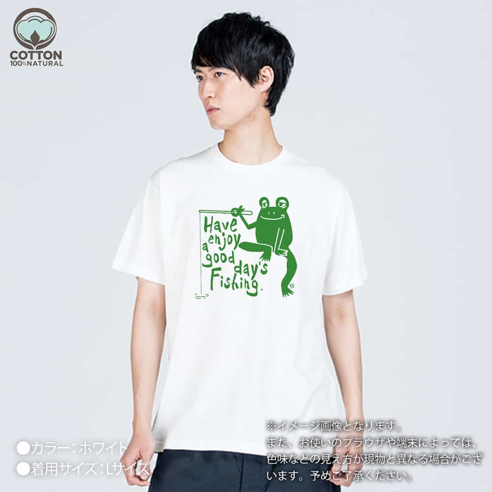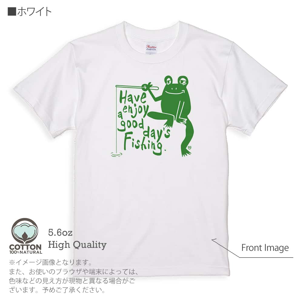商品説明ヘンテコなカエルが、葉っぱの傘の下で釣り竿を持ち、釣り糸を垂らして何かを釣ろうとしているデザイン。かえる好きな人にも釣り好きな人にもオススメです!