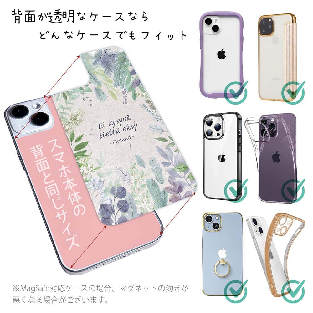 【ここがポイント!】 1 手軽にinするだけ:ケースを替えずに、シートを差し込むだけで背面のデザインを自由に変更可能。 2 こだわりの質感:細部まで質感を追求した上品な仕上がり。気分やスタイルに合わせて彩ります。 3 全機種対応の汎用性:背面が透明なケースならiPhoneやAndroid(Xperia Galaxy AQUOS OPPO Pixel等)を問わず幅広く使用可能。