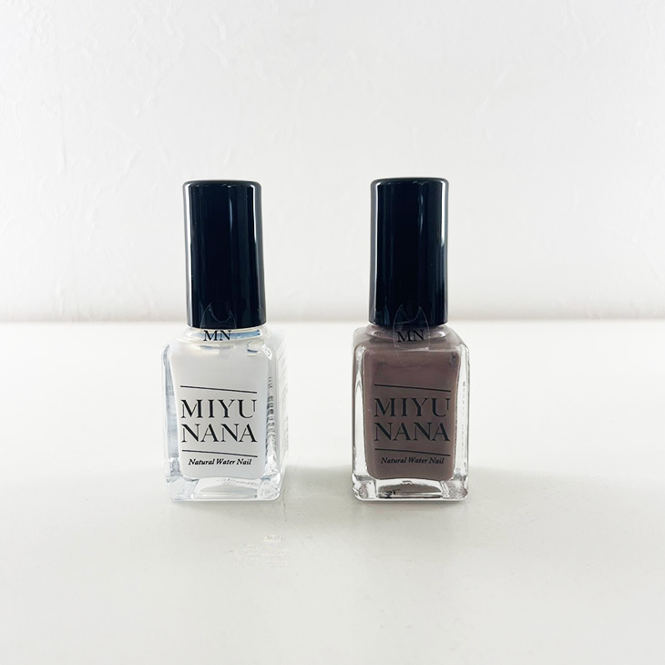 従来のマニキュアやジェルに含まれる有害な有機溶剤や顔料は使わず自然素材の胡粉顔料での色付けなので爪だけではなく肌にもやさしい水性ネイルです。有機溶剤入りのネイルをオフするには除光液が必要ですがMIYUNANAはお湯でオフできます。