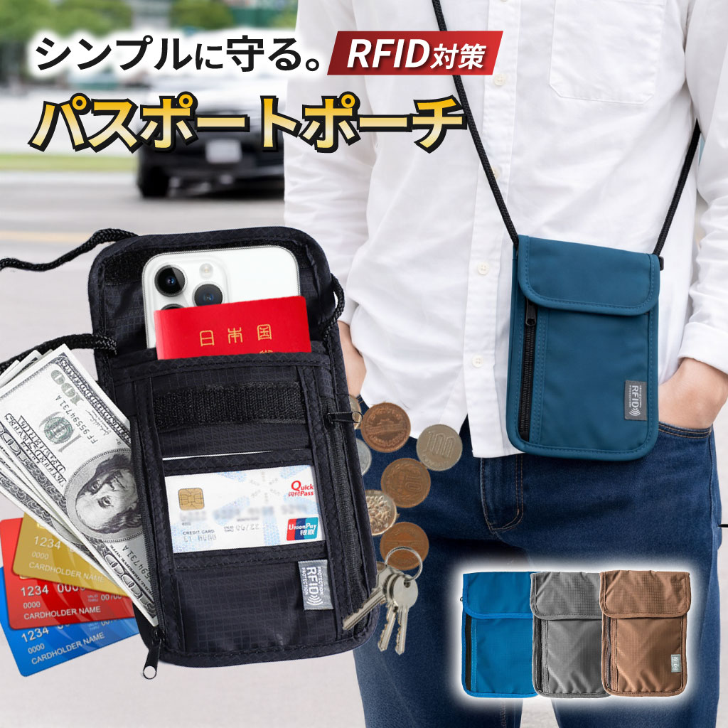 海外旅行や外出時の貴重品を安全かつスマートに管理できる、RFIDスキミング防止機能付きの首下げパスポートポーチ。