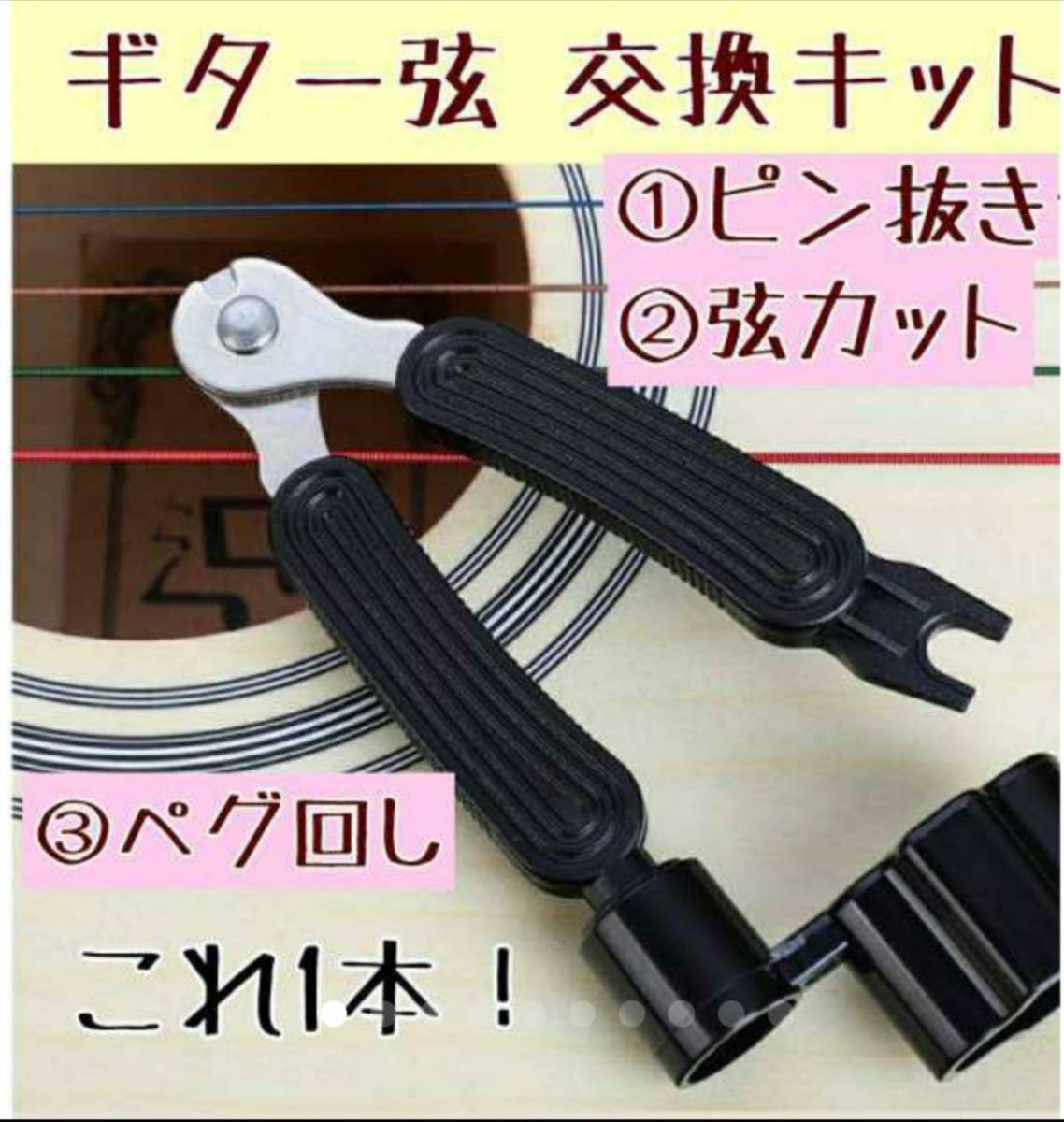 ギター弦交換時に必要なペグ回し、ニッパー、ブリッジピン抜きの3つの機能がワンセットになった万能な便利グッズ!