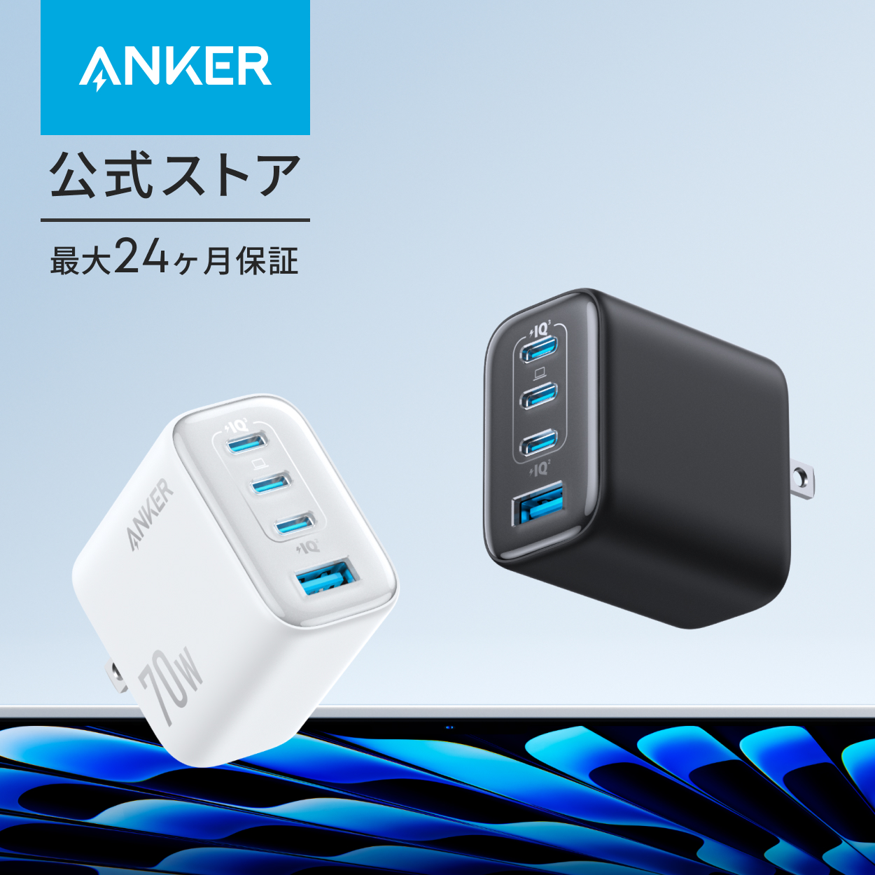 MacBook Airを急速充電単ポート最大70W出力に対応。スマホやタブレットはもちろん、MacBook Airにも急速充電が可能です。