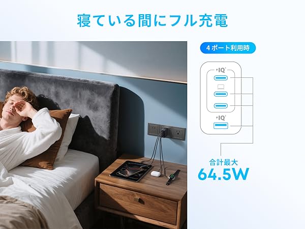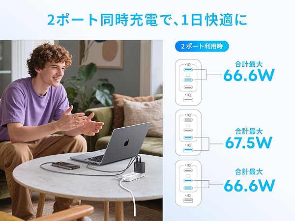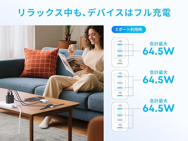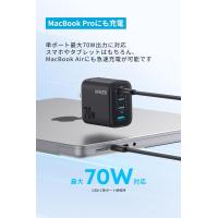 4台まとめてこれひとつ3つのUSB-Cポートと1つのUSB-Aポートで合計64.5W、単ポート最大70W出力が可能なため、MacBookを含む複数のデバイスを同時に急速充電が可能です