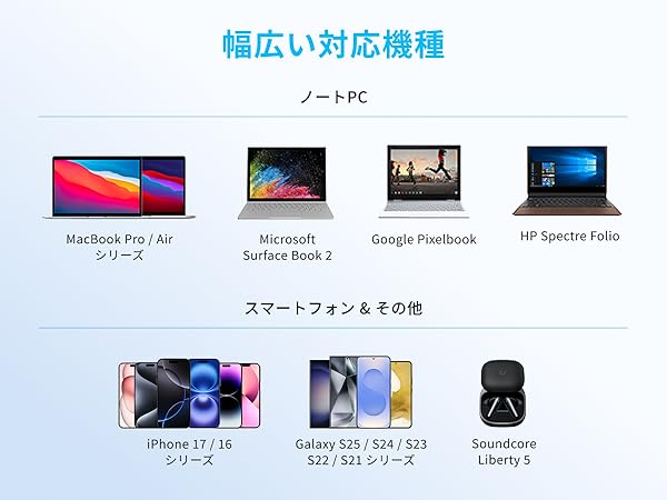 -スマートフォン:iPhone 17 / 16 / 15 / 14 シリーズ、Samsung Galaxy S25 / S24 / S23 / S22 シリーズ、Samsung Z Fold4 / 5 / 6 / 7、Google Pixel 10 / 9 / 8 / 7 シリーズ
