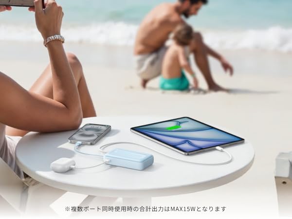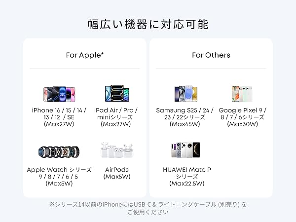 スマホに急速充電最大30W出力でiPhone 16を含めた様々な機器に急速充電が可能です。一般的な15W出力の充電器に比べて最大2倍速く充電できます。