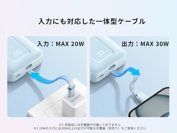 最大20Wでの入力にも対応一体型ケーブルは出力だけでなく、最大20Wでの入力にも対応します。約5時間 でバッテリー本体に満充電が可能です。