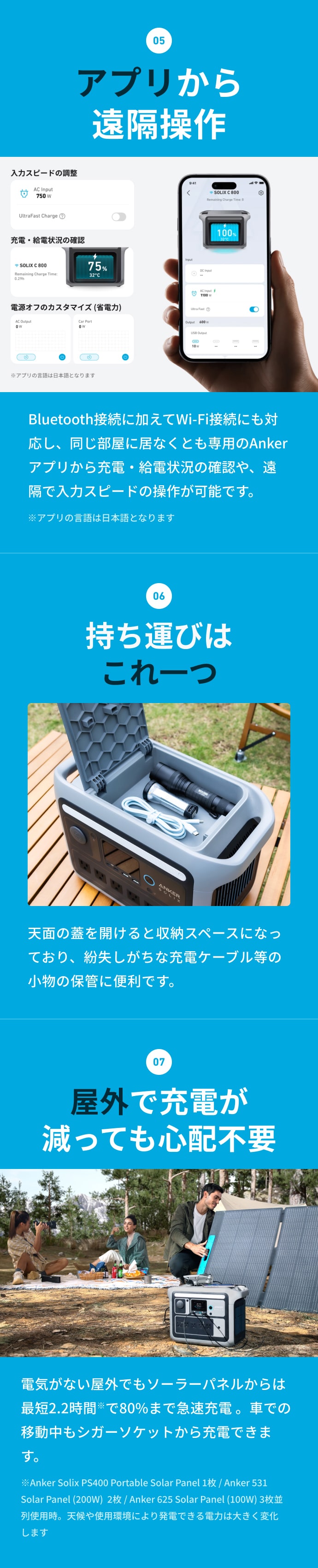 ・世界最速の急速充電:Anker独自の急速充電技術により、100%充電までわずか58分。キャンプの朝に充電忘れに気づいたり、突然の雷雨や台風で停電の可能性があっても、充電の不安がなくなります。(※2023年9月時点 700Wh帯において、20°Cのテスト環境下におけるAnker調べ。専用アプリで超急速充電モード設定時)