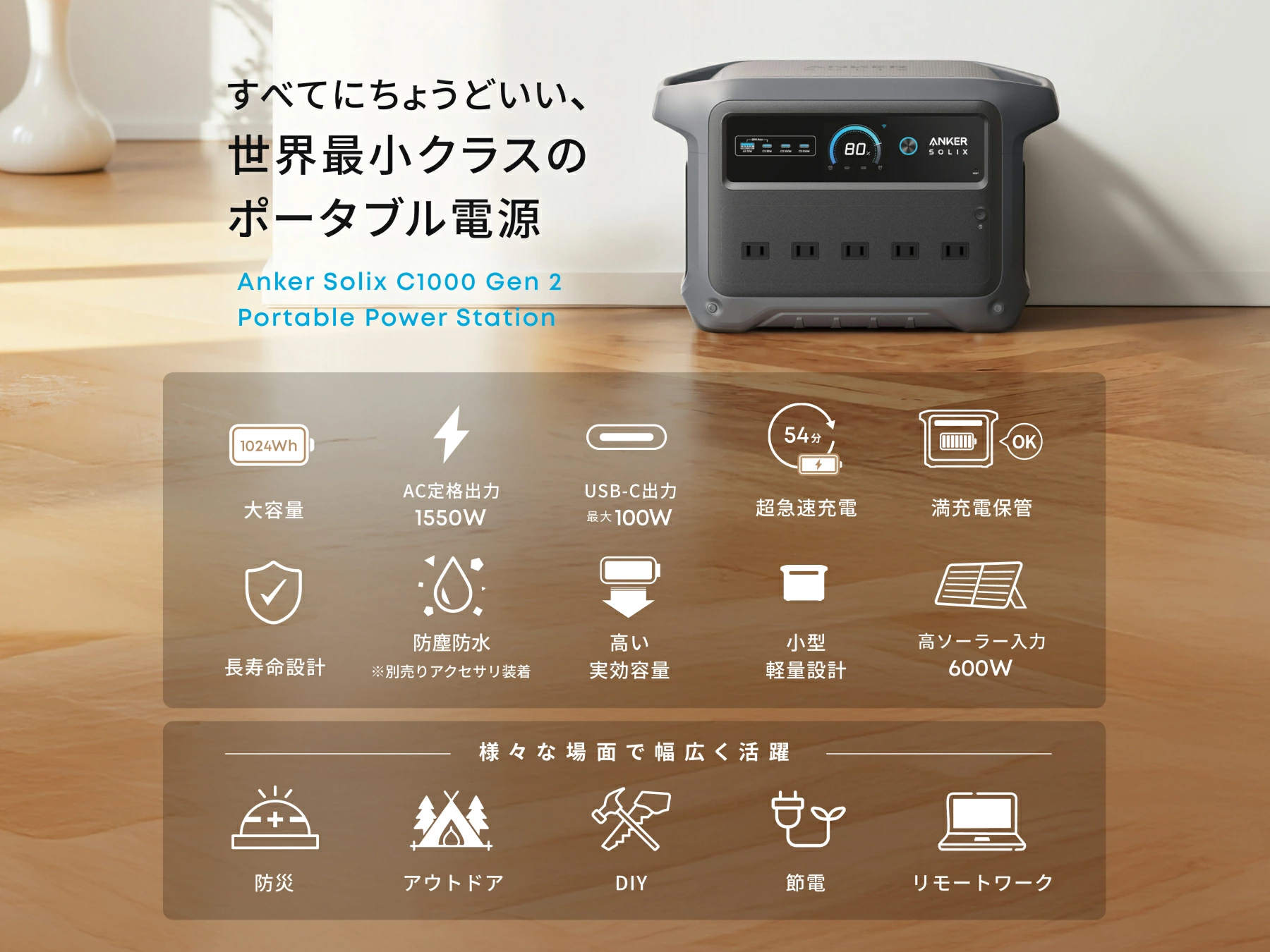 パッケージ内容Anker Solix C1000 Gen 2 Portable Power Station、AC充電ケーブル、シガーソケット充電ケーブル、クイックスタートガイド、安全マニュアル