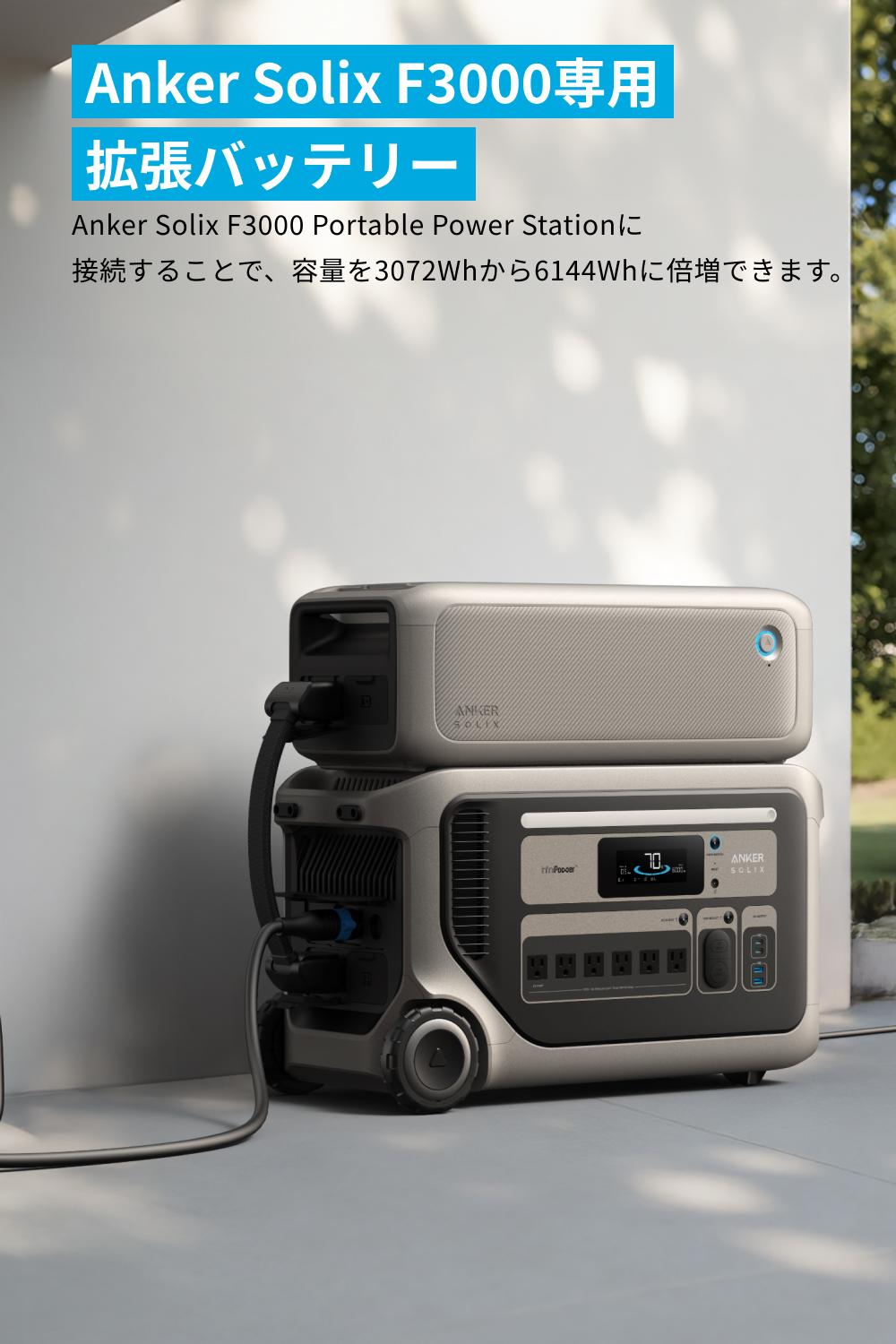 Anker Solix F3000専用拡張バッテリーAnker Solix F3000 Portable Power Stationに接続することで、容量を3072Whから6144Whに倍増できます。