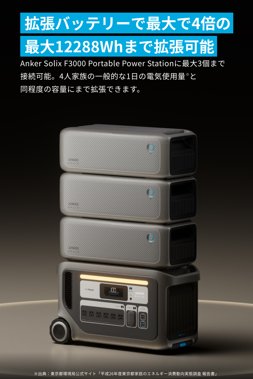 最大で4倍の12288Whまで拡張可能Anker Solix F3000 Portable Power Stationに最大3個まで接続可能。4人家族の一般的な1日の電気使用量※と同程度の容量にまで拡張できます。