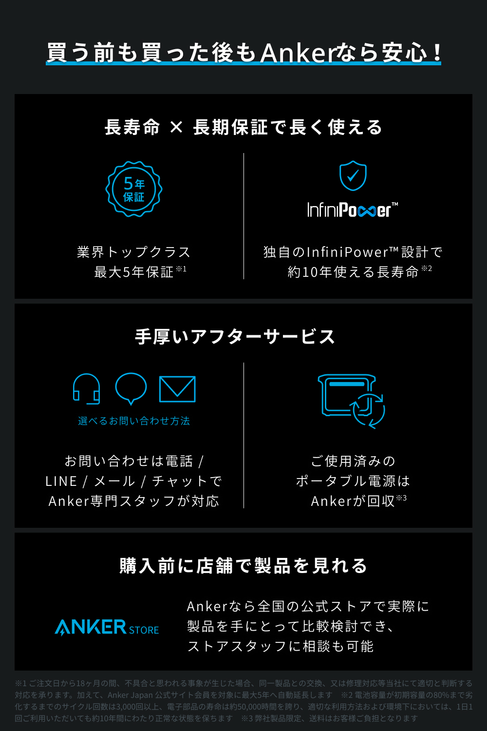 リン酸鉄リチウムイオン電池を採用電池寿命の長さと熱安定性の高さが特徴のリン酸鉄リチウムイオン電池の中でも高品質なセルを採用。Anker独自技術InfiniPowerにより、バッテリーだけでなく電子部品も約50,000時間の長寿命化を実現しました。