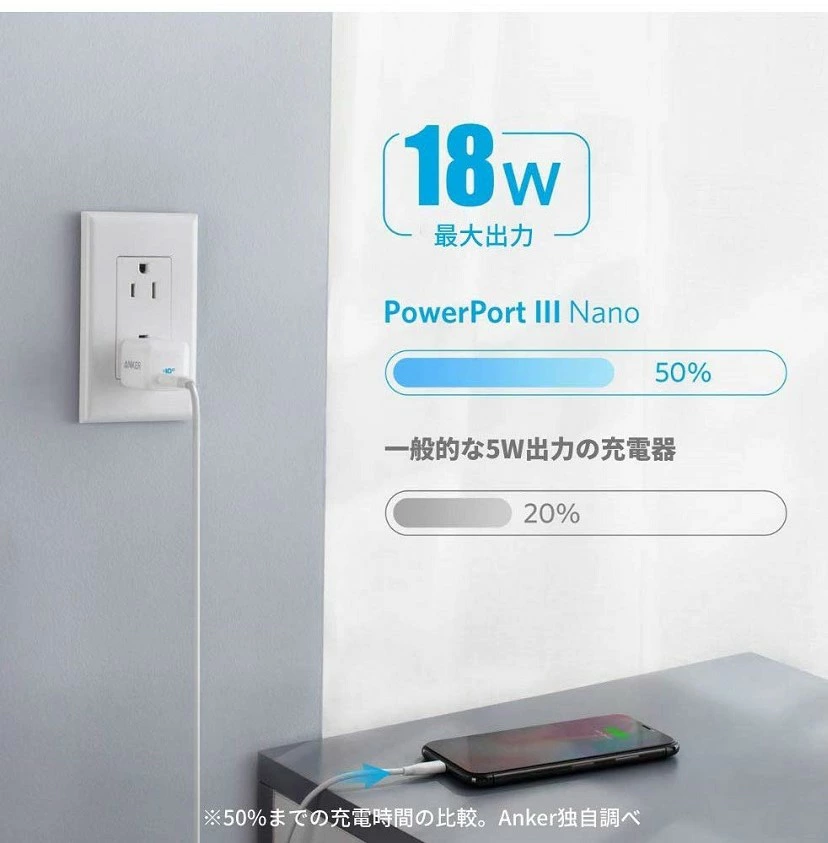 一般的な5W出力の充電器と同じ超コンパクトサイズながら、18Wの高出力を実現しました。