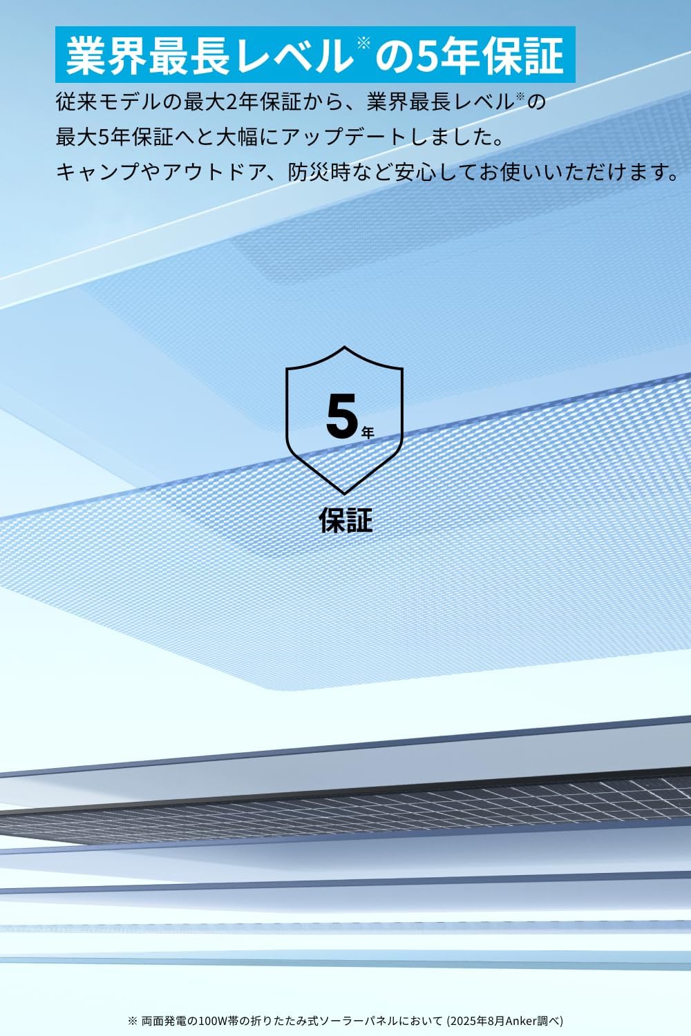 業界最長レベル※の5年保証従来モデルの最大2年保証から、業界最長レベルの最大5年保証へと大幅にアップデートしました。キャンプやアウトドア、防災時など、より安心してAnker Solix PS100 Dual Portable Solar Panelを使い続けることができます。 ※両面発電の100W帯の折りたたみ式ソーラーパネルにおいて(2025年8月Anker調べ)。