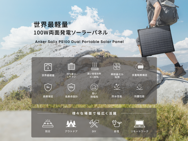 世界最軽量※を実現した100W両面発電ソーラーパネル従来モデル「Anker Solix PS100 Portable Solar Panel」から約40%軽量化。重さにして約1.8kgも軽くなり、2Lペットボトル1.5本分以下の重さに。持ち運びに優れているわずか2.8kgの世界最軽量のソーラーパネルです。