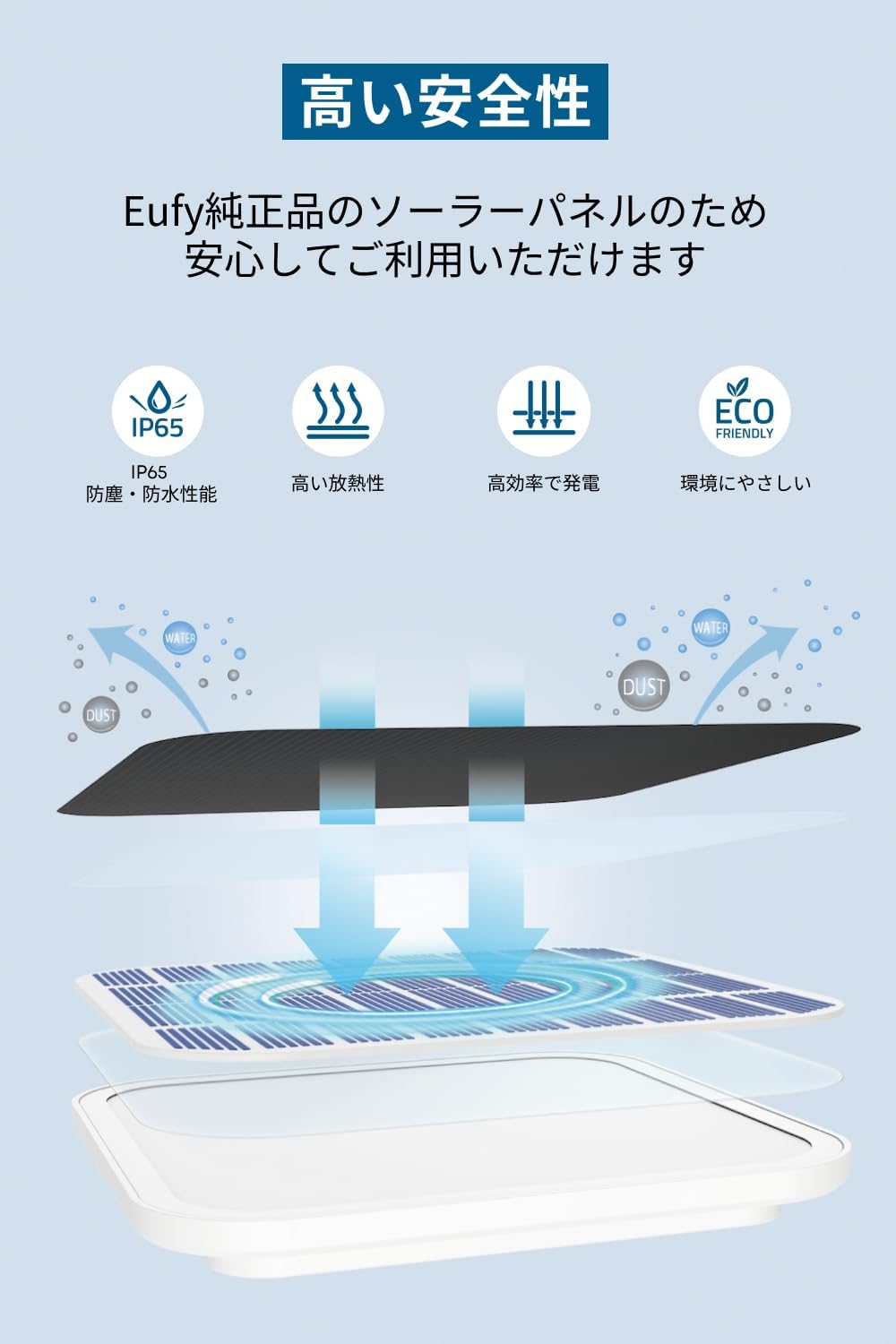 高い安全性Eufy純正品のソーラーパネルのため安心してご利用いただけます。
