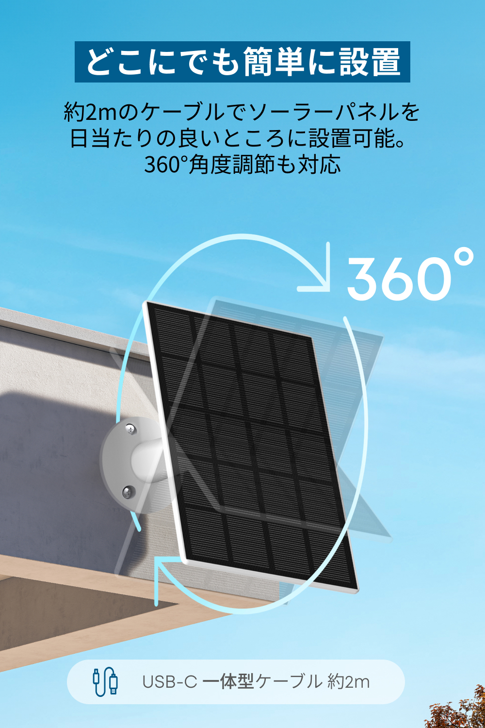 どこにでも簡単に設置約2mのケーブルで、ソーラーパネルを日当たりの良いところに設置可能。360°の自由な角度調節も対応。