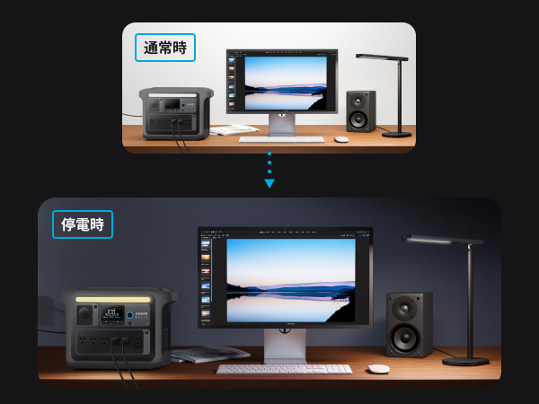 家庭用コンセントから本製品を充電しながら、本製品を通して家電や機器へ給電 (パススルー充電) できます。停電時はわずか20ミリ秒でバッテリー給電に自動で切り替わるため、バックアップ電源としてご使用いただけます。