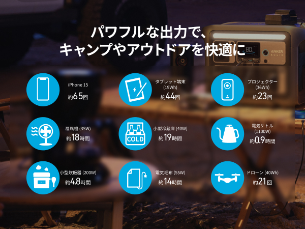 パッケージ内容Anker Solix C1000 Portable Power Station、AC充電ケーブル、ソーラー充電ケーブル、シガーソケット充電ケーブル、安全マニュアル、18ヶ月保証 + 42ヶ月 (Anker Japan 公式サイト会員登録後) 、カスタマーサポート