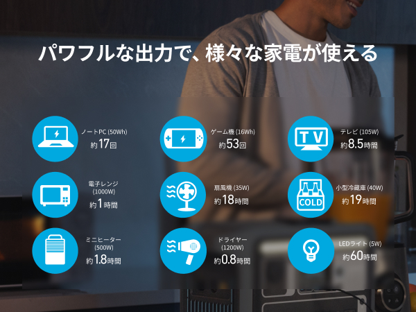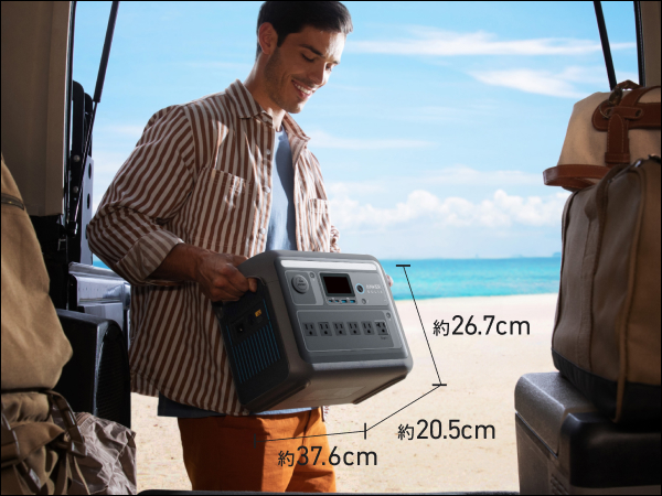 大容量かつ高出力なのにコンパクトさも両立。自宅に保管する際にも邪魔にならず、アウトドアへの持ち出しも容易です。