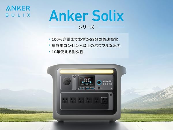パッケージ内容Anker Solix C1000 Portable Power Station、AC充電ケーブル、シガーソケット充電ケーブル、安全マニュアル、18ヶ月保証 + 42ヶ月 (Anker Japan 公式サイト会員登録後) 、カスタマーサポート