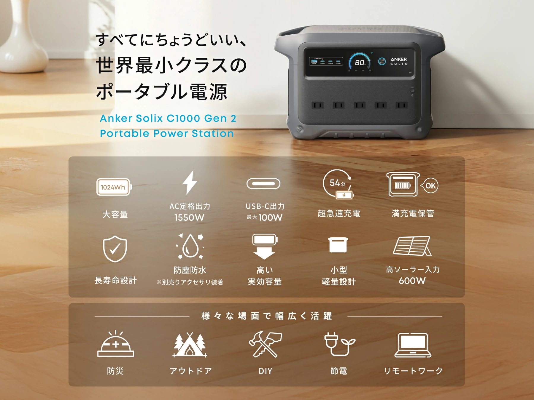 すべてにちょうどいい、世界最小クラス※のポータブル電源1000Wh以上の大容量は変わらずに、前モデル (Anker Solix C1000 Portable Power Station) から約7%の省サイズ化と約12%の軽量化を実現した世界最小クラスのポータブル電源です。※容量1000Wh帯かつAC定格出力1500W以上のリン酸鉄リチウムイオン電池搭載モデルにおいて。ハンドル部分を除く体積計算に基づく。 (2025年4月時点 Anker調べ)