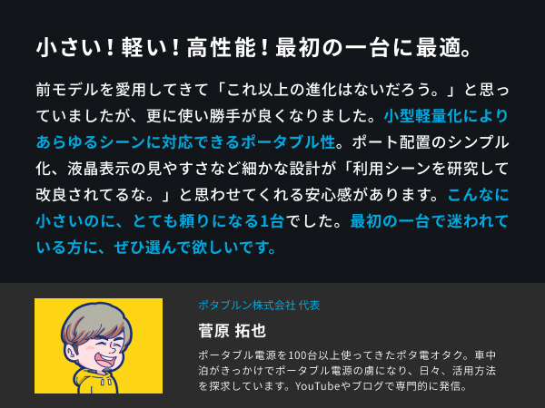 コンパクトながら十分な容量を備え、1〜2泊の電力をこれ1台でまかなえます。また、静音性にも優れており図書館よりも静かな20dbで、夜間でも音が気になりません。