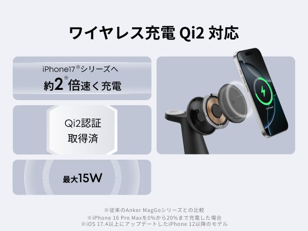 ピタッと充電、絡まずスッキリマグネット式ワイヤレス充電対応の3-in-1充電器。Qi2対応のスマートフォンに従来のAnker MagGoシリーズの2倍の最大15W出力でワイヤレス充電が可能です。(※ 現在対応している機種は、iOS 17.4以上にアップデートしたiPhone 12以降のモデルのみとなります)