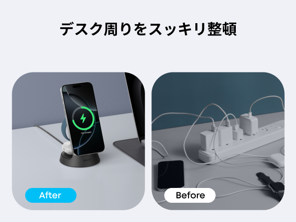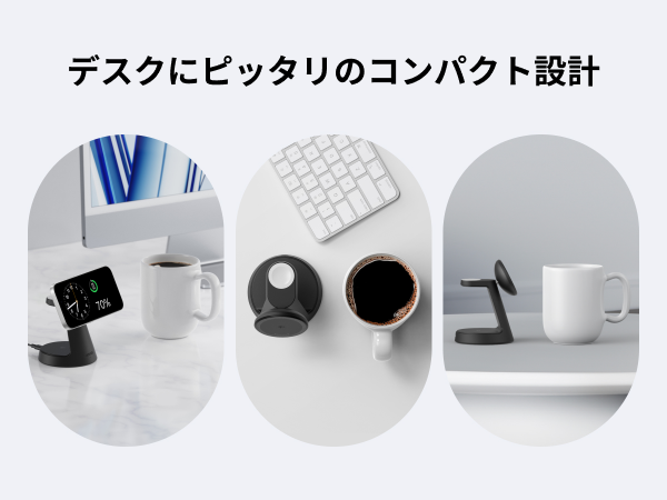 3台まとめてこれ1つこれ1台でQi2対応スマートフォンやワイヤレスイヤホン、Apple Watchの3台を同時に充電可能です。