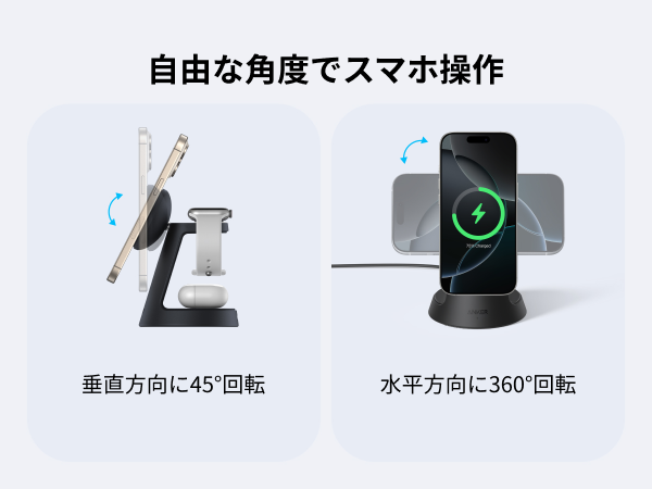 自由な角度でスマホ操作垂直方向に最大45 度まで角度調整が可能。充電しながら見やすい角度でスマホ操作ができます。