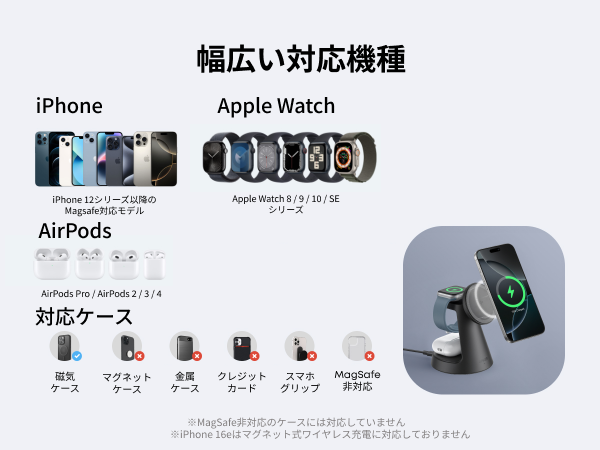 ・本製品は MagSafe 非対応のケースには対応していません。ケースをお使いの場合は必ず MagSafe 対応のケースをお使いください。