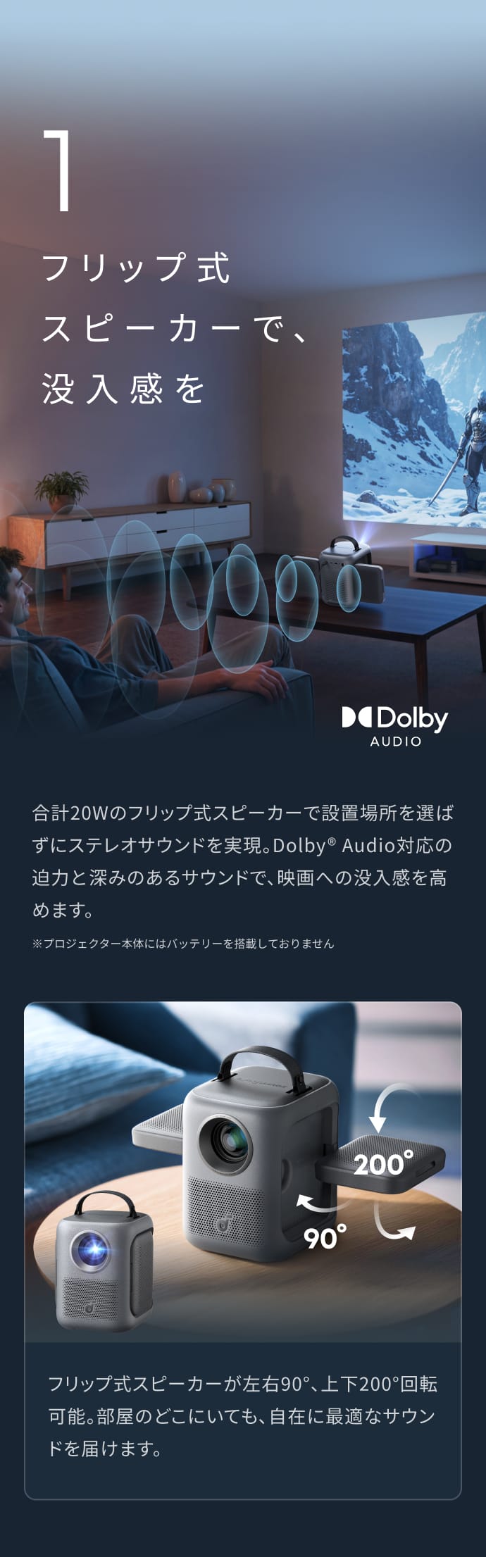 フリップ式スピーカーで、没入感をDolby Audio対応の迫力と深みのあるサウンドで、映画への没入感を高めます。