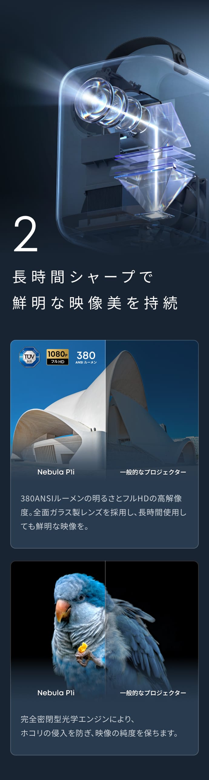 明るく、くっきり。フルHDの大画面380ANSIルーメンの明るさとフルHDの高解像度。全面ガラス製レンズと密閉型光学エンジンにより、明るくクリアな映像を長時間持続して投影。最大150インチの大画面で迫力ある映像体験を。