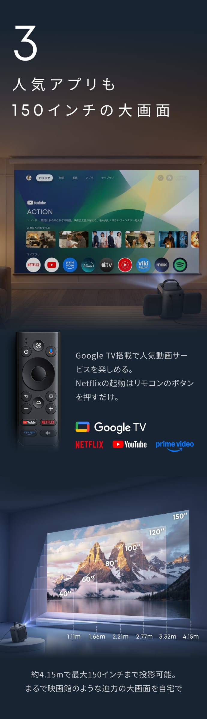 投影サイズ40 - 150インチ