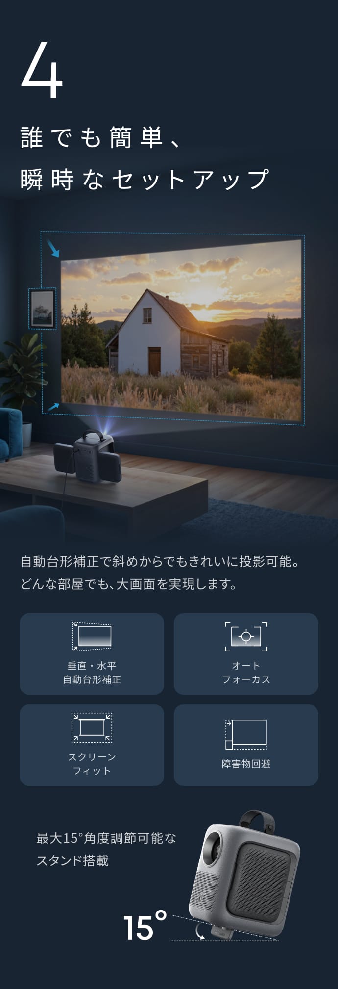 誰でも簡単、瞬時なセットアップ独自技術「IEA 3.0」により、垂直・水平の自動台形補正、オートフォーカス、スクリーンフィット、障害物回避で、設置から視聴までスムーズ。斜めからの投影でも簡単に調整できます。