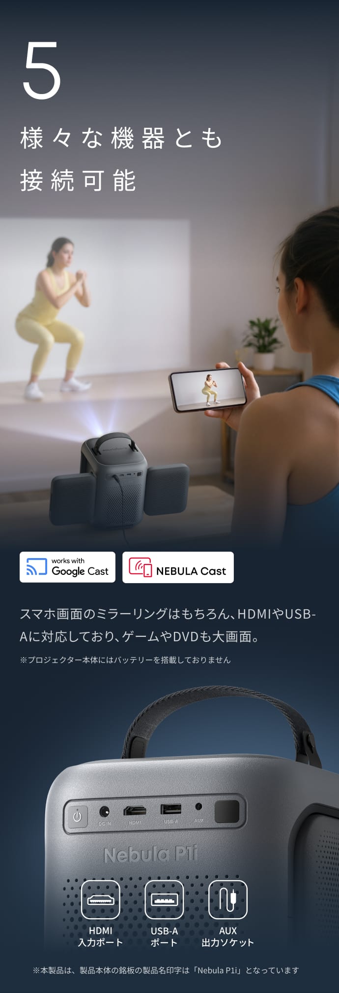 ※プロジェクター本体にはバッテリーを搭載しておりません。