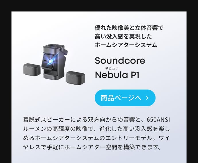 世界初※フリップ式スピーカー搭載ホームプロジェクター合計20Wのフリップ式スピーカーで設置場所を選ばずにステレオサウンドを実現。380ANSIルーメンの明るさとフルHDの高解像度。音の向きまでこだわった、新しい映像体験。